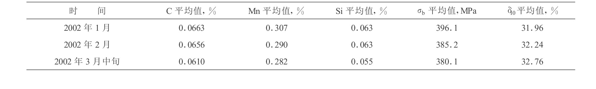 在进行研究前, 生产Q195L线材的化学成分按表 1要求进行控制, 生产过程工艺的控制与建筑用线材生产基本相同, 结果Q195L命中率很低, 表 3为研究前(2001年8~9月)的实际生产指标。