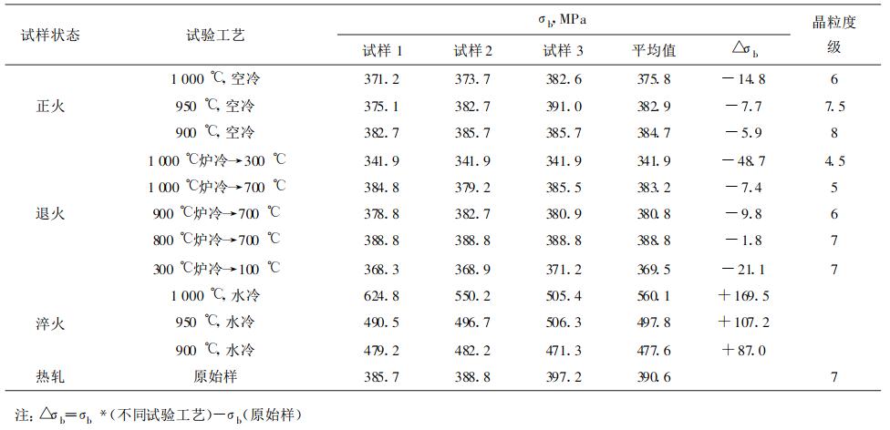 试样来自同一根Q195L盘条, 加热是在箱式电阻炉内进行, 炉温升至事先设定的温度后, 将试样放入炉内加热保温10 min, 然后以不同的冷却方式冷却, 再测σb和晶粒度。试验结果见表 6。