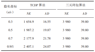 3.2 算法隐私保护性分析实验为了对本文所提出的TCDP算法和三元闭包算法的隐私性作统一的度量,引用信息熵中的边熵来衡量算法的隐私效果,以此为评价依据衡量隐私预算变化所带来算法隐私程度的变化。由于不确定图具有不确定性,所以算法的边熵值越大,生成的不确定图的不确定程度也越大。表 1为TCDP算法在不同隐私预算下边熵值的变化情况,表 2为三元闭包算法在不同调节边数因子下边熵值的变化情况。