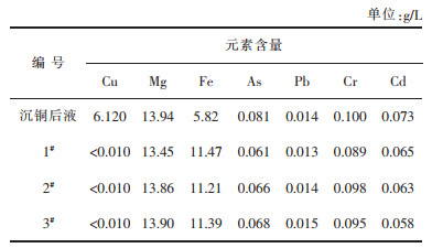 2.6 铁粉沉铜由于废耐火砖长时间的堆放部分铜会被氧化,酸浸脱镁的过程中被浸入液相,这部分铜需要进行回收。从含铜、砷的废酸液中回收铜、砷等重金属有多种方法,主要包括硫化物沉淀法、铁氧体法、絮凝沉淀法、中和沉淀法等 [8-12],但这些方法存在沉淀渣量大,且生成的沉淀物易造成二次污染的问题。本实验浸出液中砷的含量低,为铁屑置换铜离子成为了可能[13]。采用铁屑置换铜离子,是一种简单高效的回收铜的方法[14-15]。取含铜浸出液为原料,开展三组重复性试验。废铁屑加入量为理论量的120%,常温下反应60 min,反应结束后,分别对1#、2#和3#号沉铜液进行化学成分检测。表 3为废铁屑置换铜离子后的沉铜液的化验结果。三组实验液相中的Cu含量都小于10 mg/L,铁浓度由初始的5.82 g/L提高至11 g/L以上,溶液中Mg、As、Pb、Cr、Cd等元素浓度基本不发生变化。