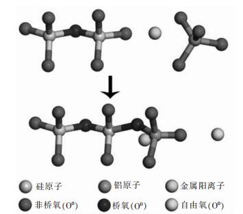 从对熔体结构已有的研究可以看出,熔剂对CaO-Al2O3-SiO2系保护渣熔体结构的影响大致分为两类:①金属氧化物提供O2-和桥氧(O0)反应生成非桥氧(O-),破坏存在的复杂铝硅酸盐结构而降低网络结构的聚合度,熔体结构解聚示意如图 1所示;②金属氧化物提供电荷补偿作用较强的金属阳离子来平衡Al3+与Si4+的电荷差,而使得铝酸盐结构单元与硅酸盐结构单元结合形成较为稳定的复杂网络结构,其熔体结构通过电荷补偿效应聚合的示意图,见图 2所示.另外,研究表明铝硅酸盐中的铝酸盐有3种配位数[18],即[AlO4]5-、[AlO5]7-和[AlO6]9-.这三种结构之间的相互转换导致了铝酸盐结构的不稳定性,其在熔体中的作用机理还未被探明,而这对研究和开发CaO-Al2O3-SiO2系保护渣具有重要意义.