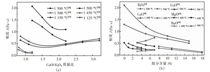 从目前的文献来看,针对CaO-Al2O3-SiO2系保护渣粘度和结晶行为的研究较多且相对系统,现将保护渣组分对非反应型保护渣粘度和结晶的影响分别总结于图 3和表 1中.从图 3(a)中可以看出,CaO-Al2O3-SiO2系保护渣的熔剂不同则渣系粘度相差较大,但均表现出了非反应型保护渣的粘度随CaO/Al2O3比的增加先下降后上升的趋势.图 3(b)可以看出,大多数熔剂都是起到降低保护渣的粘度的作用,只有BaO表现为增加保护渣粘度的效果.通常,为保证保护渣具有良好的润滑性能,要求保护渣1 300 ℃时的粘度在0.05~0.15Pa·s之间.从图 3中的粘度检测结果来看,CaO-Al2O3-SiO2系保护渣的粘度普遍偏大,这导致了非反应型保护渣的润滑性能较差.因此,需要通过研究各熔剂对CaO-Al2O3-SiO2系保护渣粘度影响的效果,从而选择有效的熔剂来改善非反应型保护渣的润滑性能.从表 1中可以看出,大部分组分对非反应型保护渣的结晶都是抑制效果,只有当CaO/Al2O3比、Li2O含量超过一定值时和Na2O含量在2%~6%可以起到促进非反应型保护渣的效果.因为CaO-Al2O3-SiO2系保护渣的结晶能力过强,在选择CaO/Al2O3比和熔剂及其含量时应考虑抑制CaO-Al2O3-SiO2系保护渣的结晶.