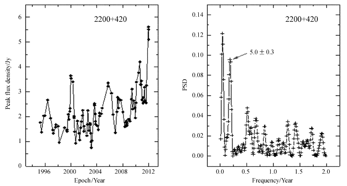 利用功率谱密度函数对每个射电源的光变曲线进行了周期分析。 作为例子,图 1给出了射电源BL Lac(2200+420)的周期分析结果。其中左图是蝎虎天体15 GHz的光变曲线,右图是功率谱分析得到的一个可能的光变周期5.0 ± 0.3年。