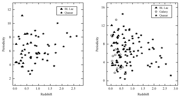 搜集了110个活动星系核,包括22个蝎虎天体、74个类星体与14个射电星系(Radio Galaxy)14.5 GHz的光变周期[11]并绘制了110个活动星系核的周期与红移的关系,如图 2(右)中,相关分析得到110个活动星系核的周期与红移的Spearman相关系数是-0.08,显著度是0.39,这表明110个射电源的光变周期与其红移没有相关性。如果只考虑96个蝎虎天体与类星体,相应的Spearman相关系数是-0.10,显著度是0.36。另外,对于22个蝎虎天体与74个类星体,它们的平均周期分别是6.95年与6.36年,通过K-S检验,这两类活动星系核的分布没有显著的不同。