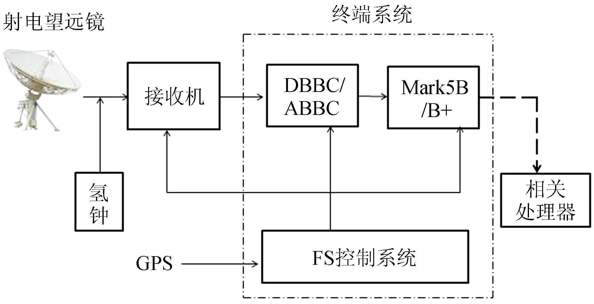 VLBI终端系统主要包括基带转换(ABBC/DBBC)系统和高速数据记录系统——Mark5B,它是目前国际上通用的终端系统,在VLBI技术中起着举足轻重的作用。由望远镜接收的射频信号经接收机混频和放大后转换为中频信号,通过基带转换器把中频信号转换为基带信号,然后经过削波、采样、格式化和A/D变换,最终把基带信号记录到磁带或硬盘上[1],观测结束后,再把硬盘寄到数据处理中心进行数据回放和相关处理。图 1为VLBI系统简图,其中,氢钟给整个系统提供标准频率信号以及1PPS信号,虚线部分为终端系统。FS控制系统主要用来控制ABBC/DBBC、Mark5B记录系统以及发送望远镜的方位和俯仰位置指令信息等,同时FS系统还可以监视各分系统的状态,包括Mark5B记录系统的状态。FS系统时间由全球定位系统同步。