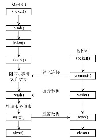 | 图 4 面向连接的套接口应用程序时序图 Fig. 4 A sequence diagram for applications of the sockets in connecting the Mark5B recording system and the monitoring computer |