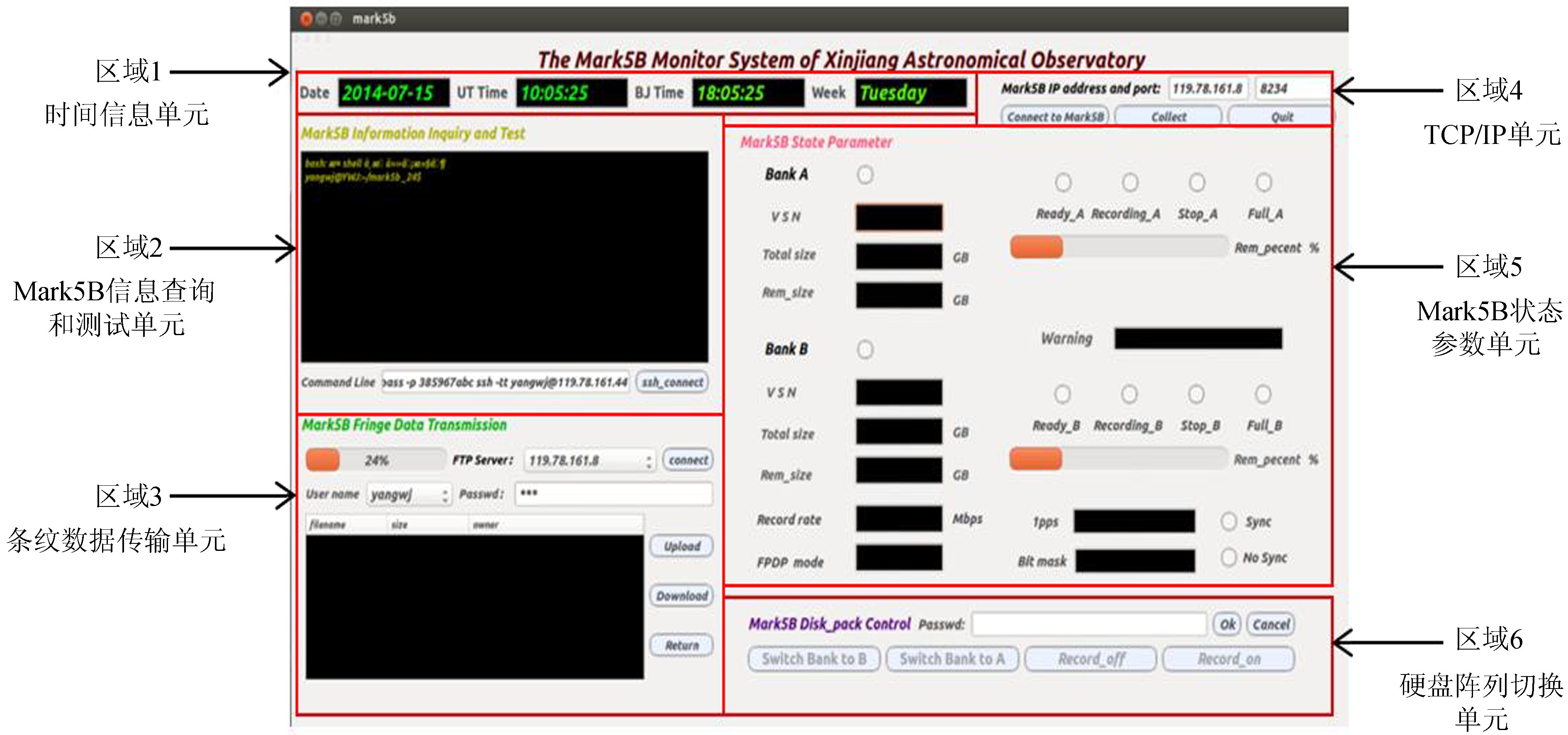 该系统包括6个区域:(1)时间信息单元,主要用来显示日期、UT时间、北京时间以及星期;(2)Mark5B信息查询和测试单元(Mark5B Unit for Information Inquiry and Test),主要用来进行有关Mark5B状态信息的查询,此外还可以进行Mark5B单机测试,检测Mark5B性能等;(3)条纹传输数据传输单元(Mark5B Unit for Transmission of Fringe Data),主要是将天文观测数据上传到数据相关处理中心,进行条纹检测,或下载观测刚要文件;(4)TCP/IP连接单元,与Mark5B建立通讯连接;(5)Mark5B状态参数单元(Mark5B Unit for State Parameters),主要包括磁盘阵列的记录状态信息、磁盘容量信息、VSN号、记录速率、FPDP模式、比特流掩码、1PPS同步状态、磁盘阵列切换功能和报警功能等; (6)硬盘阵列切换单元(Mark5B Unit for Control of the Disk Array),主要在人为干预记录譬如实验记录有故障需要中断时或在非观测期间进行数据测试时,用来对硬盘阵列进行切换和记录行为的控制。