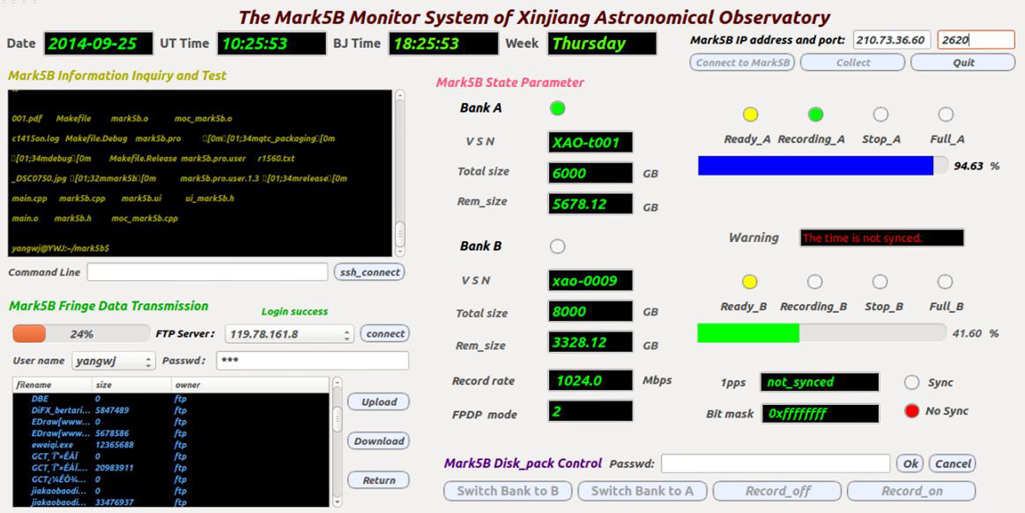 将Mark5B+工控机和监控计算机连接到网络上,运行Mark5B程序和监控程序后,分别对Mark5B记录系统的状态信息、FTP数据传输、SSH远程登陆进行了严格的可靠性、功能性、时间特性等测试,上述功能一切正常,运行状况良好,完全符合设计要求。程序运行效果如图 8。
