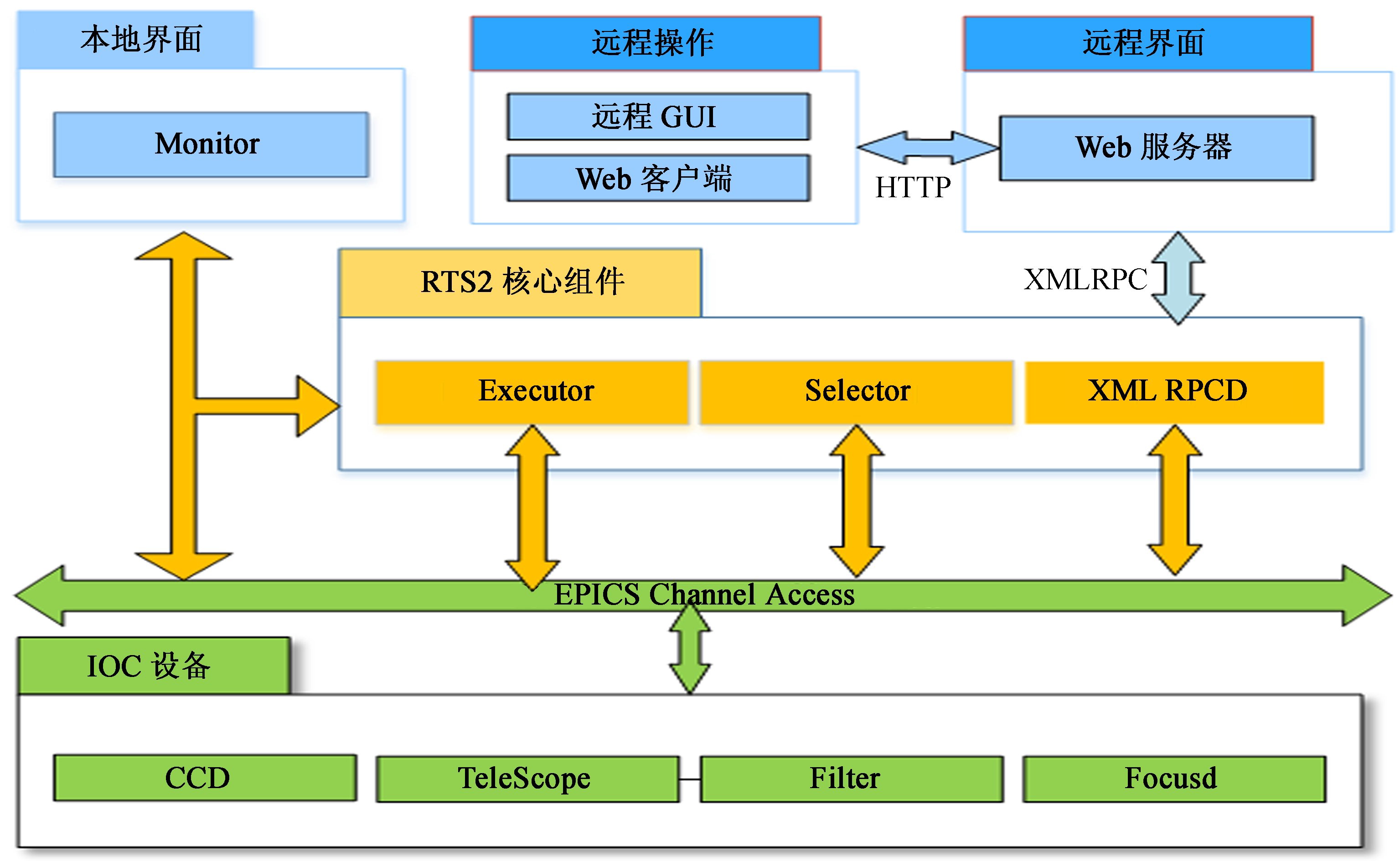 核心模块层与远程通信的组件为XMLRCPD组件,通信协议采用RTS2原有的XMLRPC http://xmlrpc.scripting.com/default.html协议。核心层组件间的通信还是原RTS2协议[2]。这里需要对这些核心组件进行修改,与底层的通信采用EPICS的Channel Access协议,使其可以和新加的输入输出控制器进行通信,需要将以前组件内的连接类(Connection类)中加入EPICS的客户端操作,如触发输入输出控制器的命令PV量,监听输入输出控制器的状态PV量等。