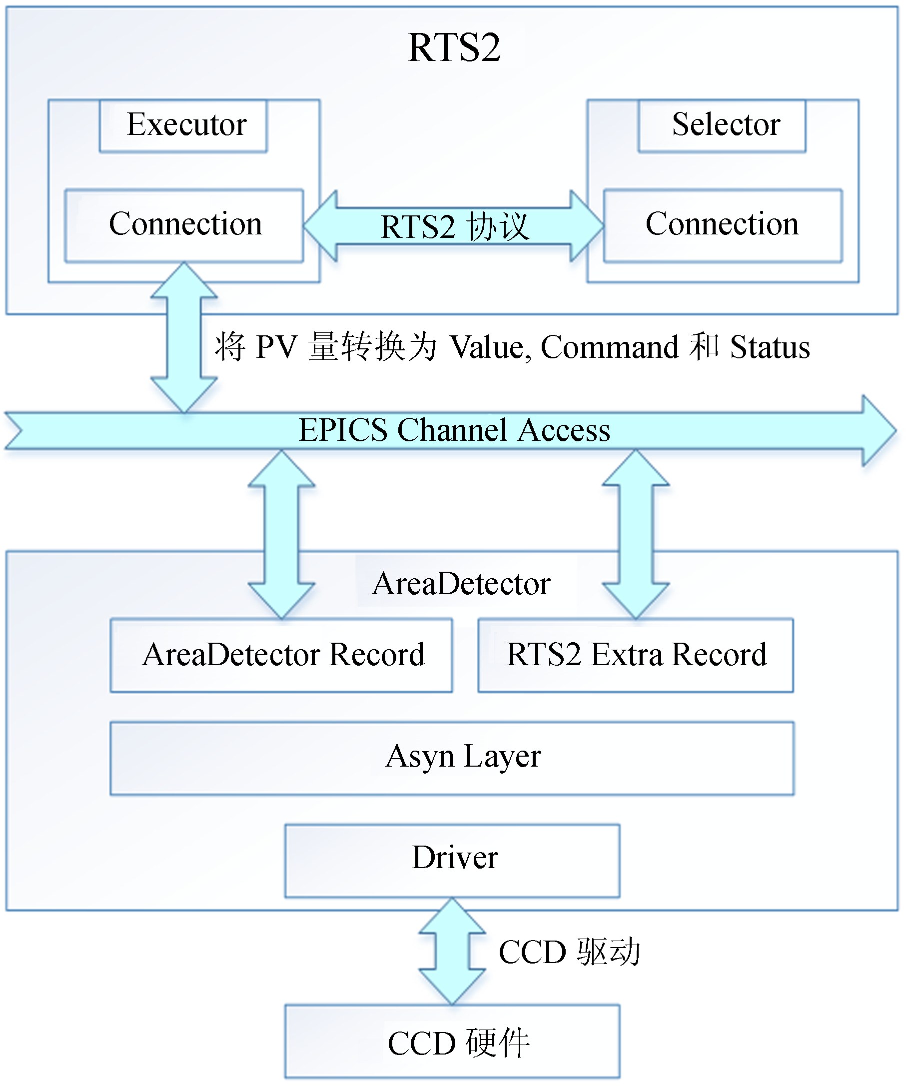 2 成像控制软件的设计成像软件由基于EPICS的一个第三方工具AreaDetector http://cars9.uchicago.edu/software/epics/areaDetectorDoc.html开发而成,通过CA通道和RTS2连接,并按照RTS2的协议完成命令和状态的接口,同时AreaDetector通过相机的驱动和相机硬件完成通讯。成像控制软件的结构如图 3。
