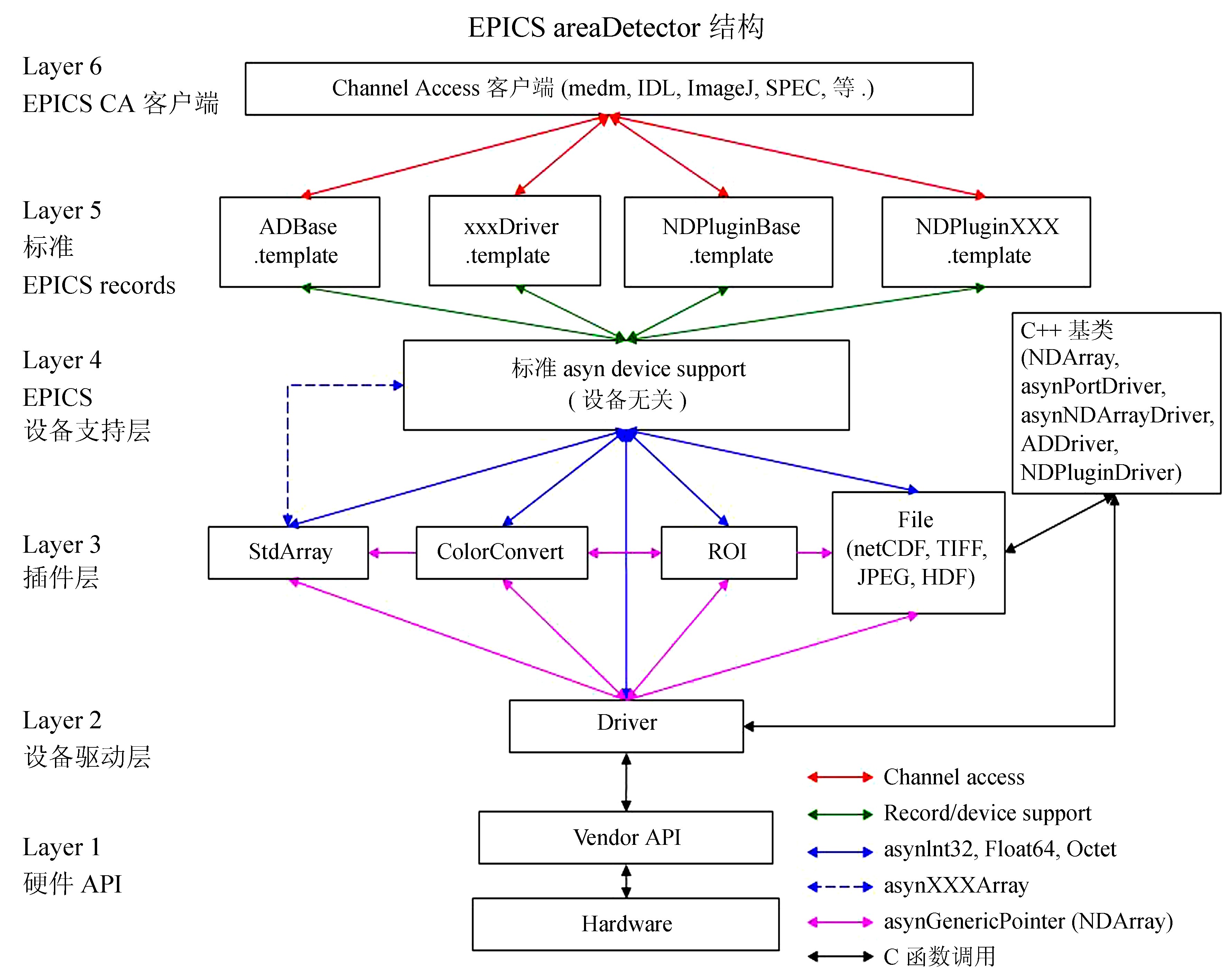 AreaDetector的结构与其他EPICS程序一样,主要分为3部分:记录层(第5层),设备支持层(第4层),设备驱动层(第2层)。记录层定义了程序的过程变量(Process Variable,PV),用来提供程序的对外接口;设备支持层定义了设备驱动层的通用接口,实现了保存图像的数据结构,以及用于图像处理和计算统计信息的插件;设备驱动层实现了不同相机设备的控制,每个相机设备都对应了一个不同的设备驱动。其中设备支持层与设备驱动层是用Asyn http://www.aps.anl.gov/epics/modules/asyn库实现的,利用面向对象的结构,实现了设备支持层与设备驱动层的隔离,从而让设备支持层可以支持不同的设备驱动。