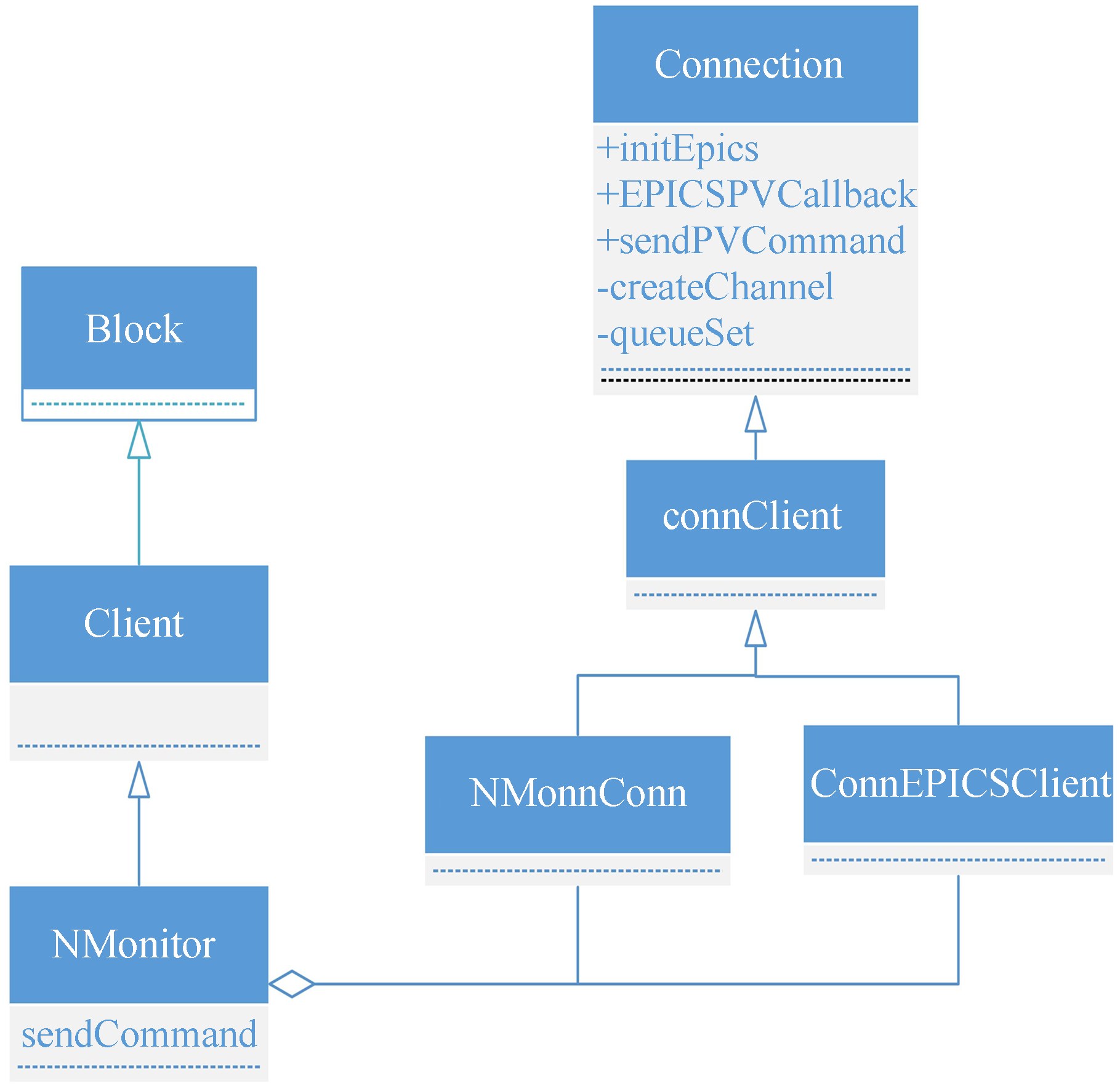 Connection类中加入一个解析XML的函数为initEpics(),在该函数中,首先解析命令PV、ValuePV和StatusPV并保存在对应的Map表中,然后对设备的ValuePV及StatusPV创建EPICS的CA客户端监听程序。这样Value或Status值变化之后,可以在监听的callback函数(EPICSPVCallback)中获取新的值,并更新到相应的Value或Status值中。然后需要在connection中加入一些处理EPICS PV量的函数,用于触发PV量的操作。