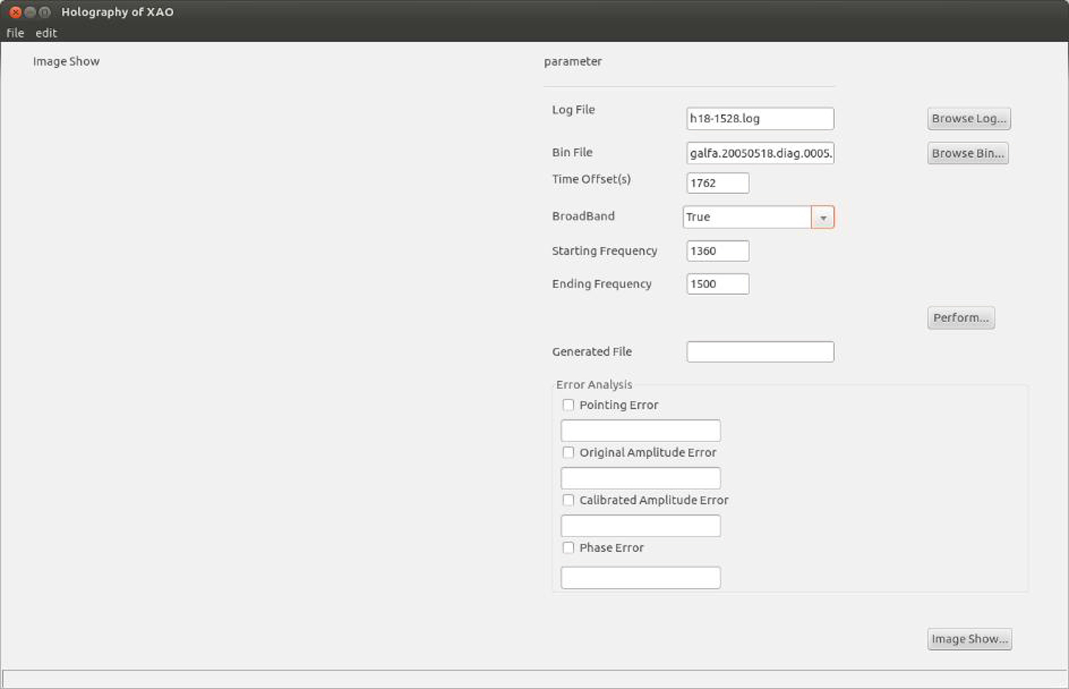 界面用Python的图形用户界面库wxpython[7]实现,提供用户参数输入和程序响应两个功能。天线控制扫描后,生成的数据存在*.bin和*.log两类文件中,*.log文件记录测量天线的时间、状态、方位和俯仰信息,*.bin文件以十六进制形式记录相关机的时间、自相关幅度、互相关幅度和相位信息。在界面中,用户选择用于校准的一组*.log和*.bin文件,是否进行宽带校准,校准的带宽范围以及时间补偿等。程序运行结束后,选择相应选项可显示误差结果,通过按钮控制,返回结果图形。