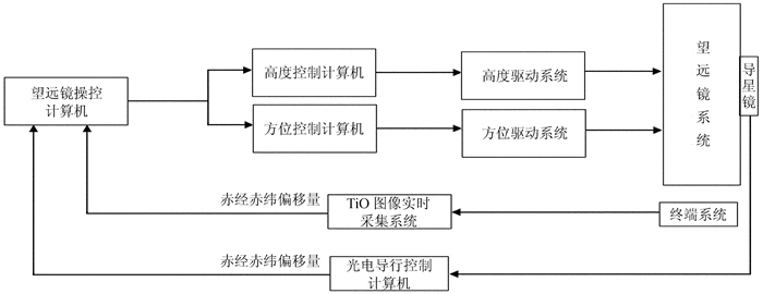 通过以上的模拟和实测分析表明,如果能实时检测望远镜折轴焦点终端系统中的图像偏移量,就能将偏移量反馈给望远镜跟踪系统进行闭环控制[6]。基于这样的反馈控制思想和目前的系统结构,本文以望远镜折轴焦点处高分辨率成像观测系统中的TiO通道建立了如图 6的闭环跟踪控制系统,当TiO成像观测系统闭环时,光电导行闭环停止工作,二者不能同时工作。由于TiO系统闭环只针对望远镜的长时间跟踪误差,频率为30 s一次,这由目前TiO采集系统工作模式决定。30 s的时间这样分配:在前20 s不间断地快速采集200幅图后,用相关算法计算偏移量并进行平均,以平滑湍流大气和随机风载引起的图像抖动,后10 s用来存储图像,同时进行图像移动量的计算和反馈控制信号的发送。