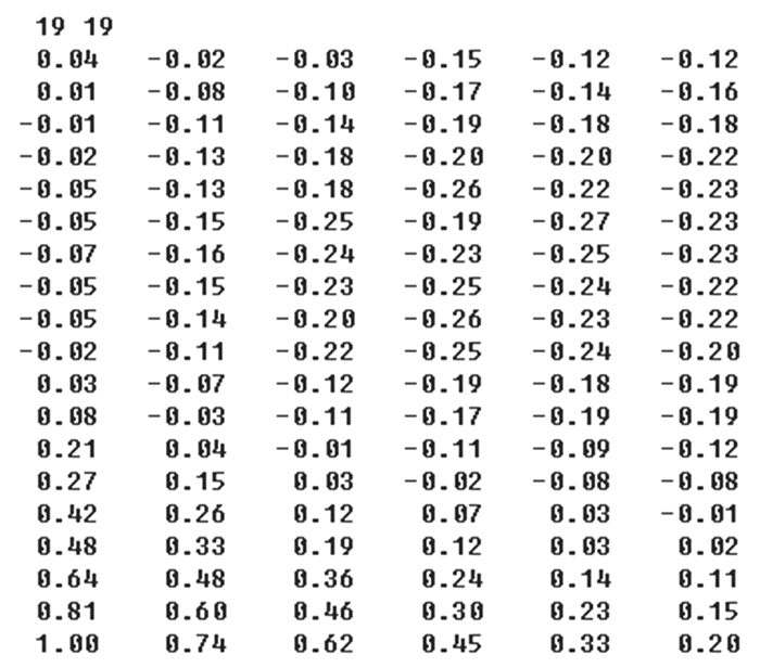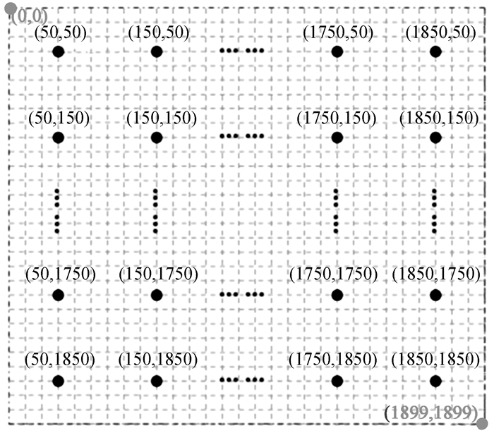 如图 1,将大小为1 900×1 900像素的图像划分为19×19个大小为100×100像素的子区域,黑点表示子区域的中心像素点(格点)。图 2为求解得到的云南天文台2.4 m望远镜B滤光片的几何扭曲矩阵的部分数值。矩阵大小为19×19,其中每一个数值代表对应格点位置的几何扭曲量。对于该几何扭曲模型数值对应的精度,文[2]做了相关研究,结果显示绝大部分几何扭曲量数值对应的标准差小于0.05 pixel,并且各个标准差的分布是相对随机的,与图像坐标没有显著的相关性。图 3是将几何扭曲矩阵放大200倍后用矢量方式绘出。从图 3可以看到,几何扭曲在图像的上面角落位置比较大。