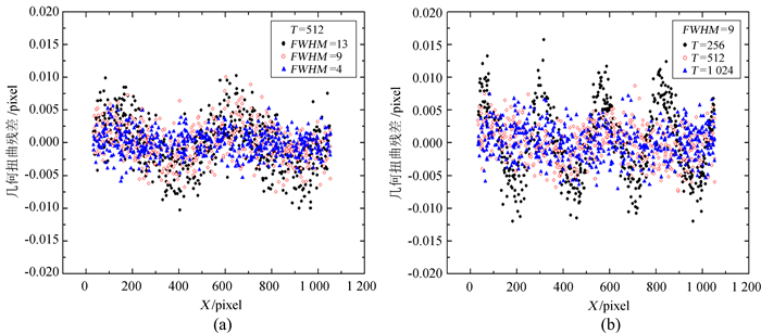从图 10(a)和表 1可以看到,当扭曲函数的周期相同时,星像的全峰半宽越大,几何扭曲残差越大。例如在固定周期T=512 pixel情况下,当FWHM=4 pixel时,几何扭曲残差最大为0.006 pixel,标准差为0.001 86 pixel;当FWHM=9 pixel时,几何扭曲残差最大增至0.01 pixel,标准差增大到0.002 76 pixel;当FWHM=13 pixel时,几何扭曲残差最大值虽然几乎没有增大,但标准差达到了0.004 pixel。从图 10(b)和表 2可以看到,当星像的全峰半宽相同时,扭曲函数的周期越小,几何扭曲残差越大。例如在固定FWHM=9 pixel情况下,当T=1 024 pixel时,几何扭曲残差最大为0.007 5 pixel;当T=256 pixel时,几何扭曲残差最大达到0.015 8 pixel。也就是说,星像的全峰半宽越大,扭曲函数的周期越小,几何扭曲残差越大。因为星像的全峰半宽越大,扭曲函数的周期越小,都将导致一个星像范围内所包含的扭曲变化越大。从图 10还可以看到,几何扭曲残差的变化趋势跟扭曲函数的变化一致。图 7中几何扭曲残差的分布在图像的四周比较大,中间部分则较小。对应图 3的几何扭曲模型,几何扭曲在图像的角落处变化较快,相当于仿真实验中的扭曲函数的周期T较小的情况;几何扭曲在图像的中间部分变化较小,相当于仿真实验中扭曲函数的周期T较大的情况。从而导致了图 7中分布在图像四周的星像几何扭曲残差较大,分布在图像中间的星像几何扭曲残差较小。