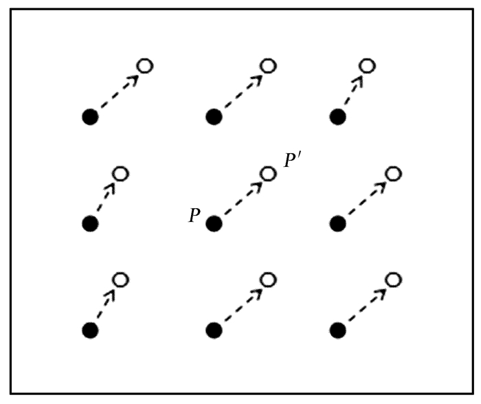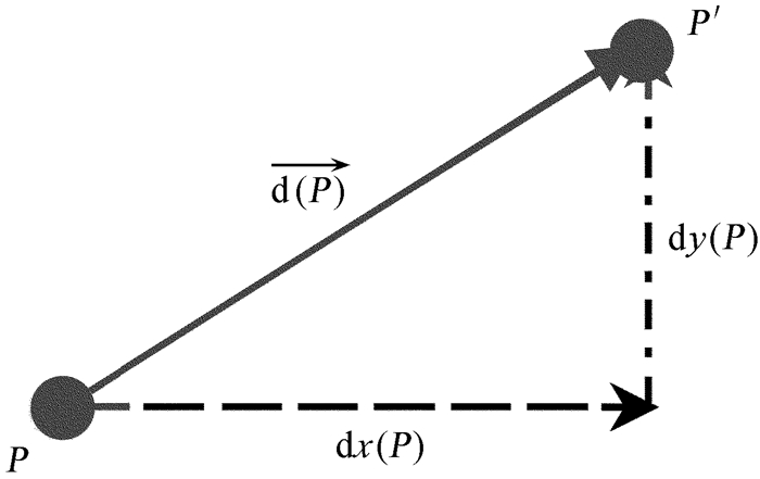 已知的几何扭曲以无扭曲位置为参考。如图 4,点P(xP,yP)受到几何扭曲后移动到P′(xP′,yP′),记为P→P′,则P点的几何扭曲为$\overrightarrow {{\text{d}}\left( P \right)} = \left( {{\text{d}}x\left( p \right),{\text{d}}y\left( p \right)} \right)$,如(1)式。