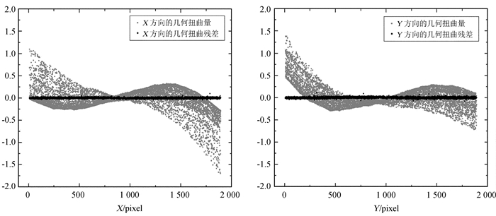 对观测的CCD图像搜星得到存在几何扭曲的星像坐标,记为B(xgd,ygd)。用(3)式计算其扣除几何扭曲后的星像坐标C(x,y)。式中C的位置未知,其扭曲量也未知,所以无法直接计算C的位置。实际上相邻位置的几何扭曲几乎相等(实际求解的几何扭曲模型最大扭曲量约为±2 pixel)。所以先用B位置的几何扭曲近似C位置的几何扭曲,求出C的近似位置,然后再用迭代的方法计算C更精确的位置。用(4)式将两组坐标相减,得到星像的几何扭曲。图 6中灰色点为星像位置的几何扭曲分别随星像位置的x、y坐标的分布情况。