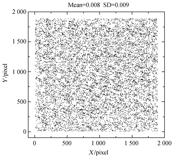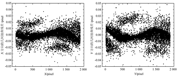 从图 6可以看到,图像做扭曲改正前,星像的几何扭曲最大可达1.7 pixel。扭曲改正后,星像的几何扭曲残差基本分布在0附近。从图 8可以看到,星像的几何扭曲残差分布的均值为0.008 pixel,标准差为0.009 pixel,并且与图 3相比明显消除了几何扭曲的区域系统性。在图 7中将残差量程缩小后,可以看到几何扭曲残差大部分在± 0.02 pixel内,但发现几何扭曲残差的分布呈现一定的系统趋势。出现这个现象,可能的一个原因是几何扭曲模型在图像边缘处的变化比较大,造成图像改正后的几何扭曲残差也比较大。为了进一步研究影响几何扭曲残差的因素,本文做了星像几何扭曲的仿真实验。
