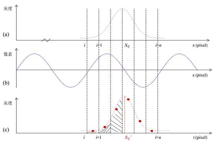 如图 9,(a)为用一维连续高斯函数模拟的星像f(x),表达式为(6)式,xc是模拟星像的中心。(b)为用正弦函数模拟的扭曲函数模型g(x),表达式为(7)式。图中为了突出星像扭曲的效果,在对扭曲函数绘图时缩小了扭曲函数的周期。实际上,一个星像范围内的扭曲变化非常缓慢。(c)为对模拟星像函数添加泊松噪声,再根据扭曲函数添加扭曲后得到的连续星像函数。根据扭曲前后模拟星像函数的积分面积不变,由(8)式可以推导出受扭曲后的连续星像函数h(t),如(9)式。