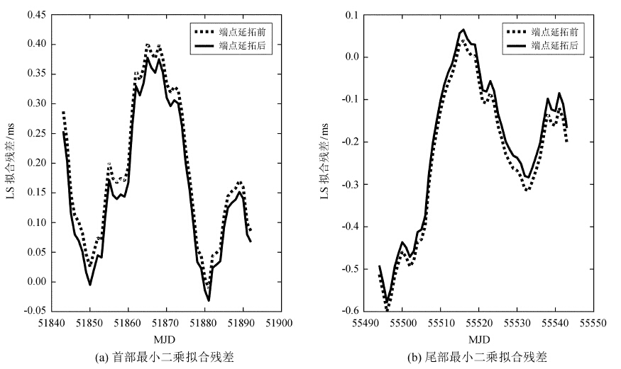 从图 1可以看到,与端点延拓前相比,端点延拓后最小二乘拟合残差在序列首尾两端更接近于0,即端点延拓后最小二乘拟合的ΔLODR序列更为准确,这说明端点延拓方法能有效抑制最小二乘拟合出现的端点效应问题。为了进一步说明端点延拓方法对端点效应的改善作用,本文选取1999年1月1日至2009年12月31日期间的日长变化数据进行拟合实验,将拟合长度取为10 a,每隔1 d拟合1次,即拟合滑动窗口为10 a,总共拟合300次,并统计每次端点延拓前后首部和尾部50个历元残差序列的均方根误差(Root Mean Square Error,RMSE),其中端点延拓前首部和尾部50个历元残差序列的300次平均均方根误差分别为0.29 ms和0.30 ms,端点延拓后首部和尾部50个历元残差序列的300次平均均方根误差分别为0.22 ms和0.23 ms,实验结果可以说明端点延拓方法对端点畸变的抑制效果。