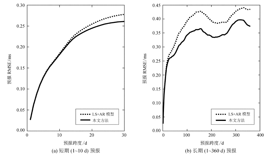 为了验证本文方法相对于常规最小二乘外推与自回归组合模型对日长变化预报精度的改善情况,分别利用这两种方法对日长变化进行1~360 d跨度预报,选用均方根误差作为精度评估指标,其计算公式为