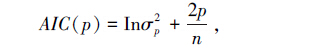 其中, σp2 为模型拟合残差的方差,当 p=1,2,… 时,使得 AIC(p) 取最小值的 p 就取作自回归模型的阶次,一般可将 p 的搜索范围设为 1~n/10或