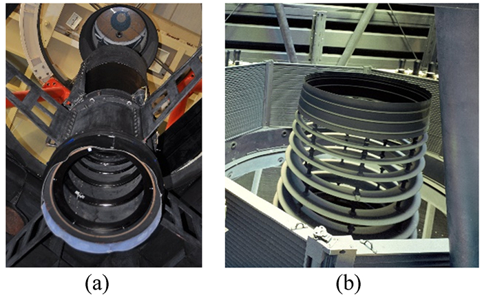 | 图 1 (a)兴隆2.16 m望远镜主镜遮光筒; (b) SDSS望远镜独立挡光环 Figure 1 (a) Primary baffle of the 2.16m Telescope at Xinglong station; (b) Vane structure of the SDSS telescope |
