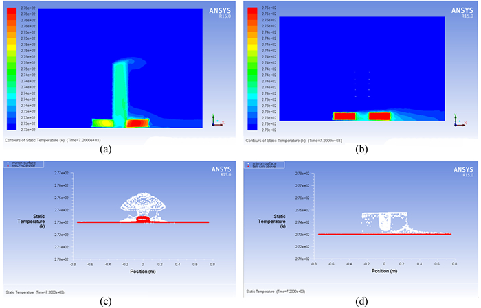 图 5为湍流状态下工况1、2的温度云图与温度散点图,散点图中白色点表示主镜表面温度,红色点表示主镜上方10 cm处的温度。从温度云图可以看出,工况1遮光筒内部与周围环境有温差。主镜散热不均匀,背风面散热慢,造成主镜表面空气存在温度差。由于处在望远镜光路中,温度差异引起的湍流会降低望远镜的分辨率。工况2主镜散热均匀,主镜表面温度梯度较小。从散点图看,工况2在主镜上方10 cm处没有温度差异,且主镜表面温度比工况1小。而工况1主镜上方10 cm处仍有温差存在于遮光筒内。