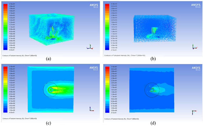 | 图 6 工况1、2湍流强度分布云图(黑色圆为主镜轮廓)。(a)工况1三维湍流分布; (b)工况2三维湍流分布; (c)工况1湍流分布俯视图; (d)工况2湍流分布俯视图 Figure 6 Turbulent intensity contours (black circle indicates the mirror′s profile). (a) 3D turbulent intensity contour of status 1;(b) 3D turbulent intensity contour of status 2; (c) Vertical view of the turbulent intensity contour of status 1; (d) Vertical view of the turbulent intensity contour of status 2 |