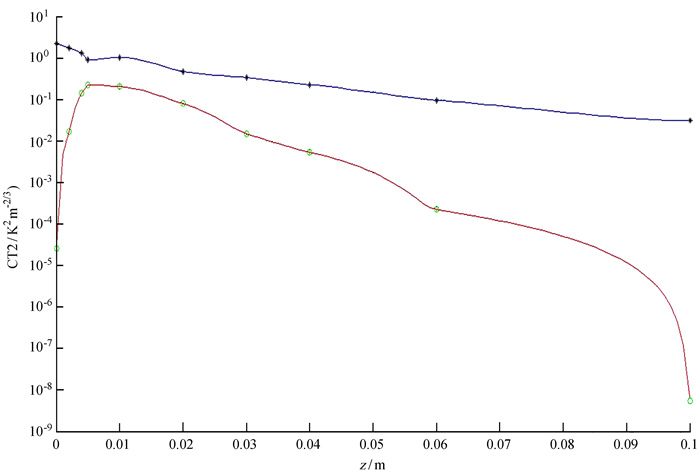 | $ C_{\text{T}}^{2}=\frac{<{{\left[T(r)-T\left( r+\Delta r \right) \right]}^{2}}>}{\Delta {{r}^{2/3}}}, $ | (2) |