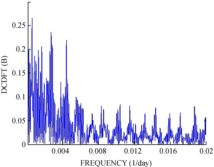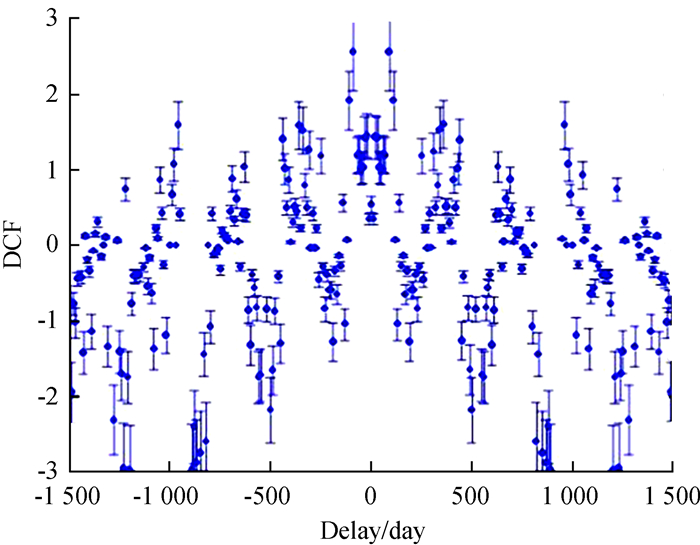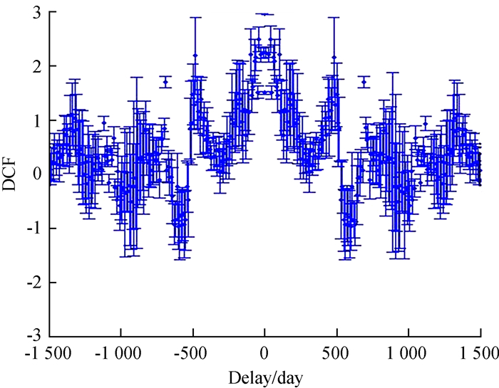 从图 3到图 8可以看出,不同的方法周期性的明显程度也不一样。时间补偿离散傅里叶变换法可以运用到天体数据处理上,可以有效地处理不均匀的天文数据,克服传统的傅里叶变换带来的伪周期。时间补偿离散傅里叶变换法通过施密特正交化,有效地解决由于1、cosωt和sinωt 3个向量不正交带来伪信号的问题[27]。用离散相关性函数对PKS 0735+178天体的B波段和V波段相关性分析,从图 7、图 8可以看出,它们之间存在很强的相关性,表明它们之间的辐射起源是相似的[24]。