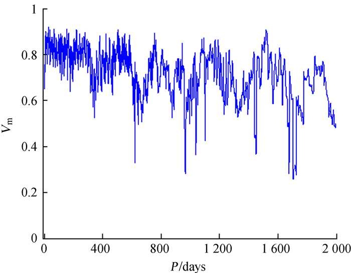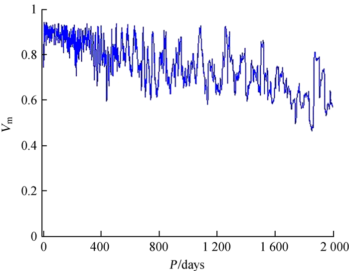 应用Jurkevich方法获得PKS 0735+178的B波段和V波段P-Vm图,由图 5、图 6可以看出,对应于Vm的最小值,B波段存在1.02年、1.20年、1.66年、4.77年的光变周期,V波段存在0.94年、1.71年、2.82年、3.97年的光变周期。根据光变周期存在的判据[20],B波段存在1.02年和V波段存在0.94年光变周期的可靠性最大,而B波段存在4.77和V波段存在3.97年次之.但考虑到平均时标为(1.11 ± 0.01)年,可能是由于地球绕太阳所致,因此B波段存在4.77年的周期,V波段存在3.97年的周期。