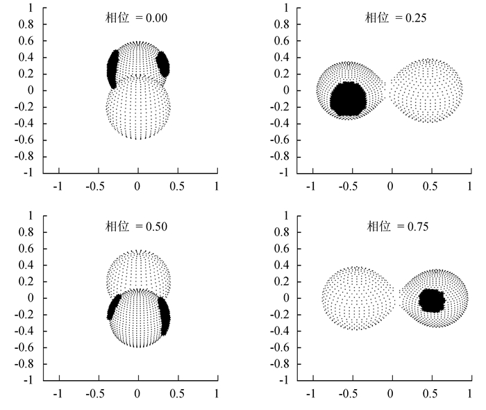 | 图 6 相位0.0、0.25、0.5和0.75处GM Boo的几何结构 Figure 6 The geometry configurations of GM Boo at the phase 0.0, 0.25, 0.5 and 0.75, respectively |