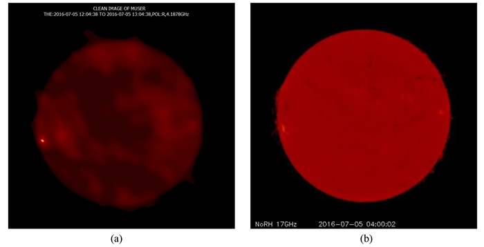 | 图 10 (a) MUSER-Ⅱ 60 min积分的太阳像;(b)野边山射电日像仪观测的太阳像 Figure 10 (a) One huor′s integration solar images of MUSER-Ⅱ; (b) Solar observation images of the Nobeyama Radioheliograph |