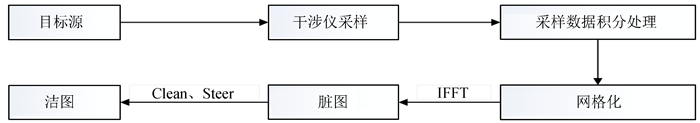 明安图射电频谱日像仪的成图过程:目标源放射出天体辐射,然后干涉仪对其进行采样,采样得到的原始数据经过预处理相关校准[13]、对应极化和通道,之后进行积分处理,再网格化傅里叶逆变换得到脏图,最后经过洁化算法处理得到洁图,过程如图 2。