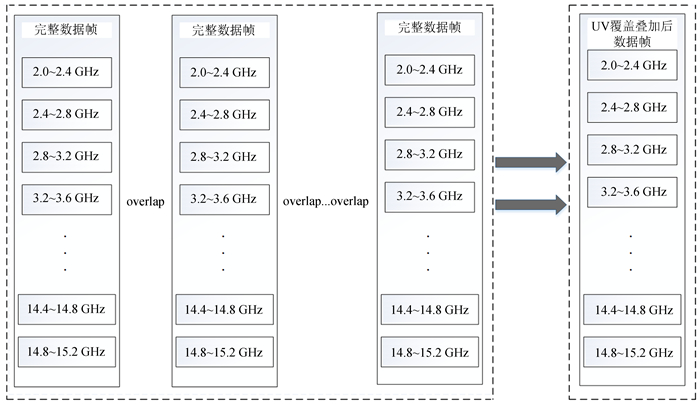 实现UV覆盖积分具体操作流程如图 4。对高频阵中数据进行UV覆盖积分同样用完整的数据帧积分,不同的是由于短时间内采样函数及其采样值都变化很小,如果用连续的帧增加UV覆盖显然效果不好,为此需要隔一段时间增加UV覆盖。UV覆盖积分得到的是一段时间间隔完整数据帧叠加的数据,同样对数据UU,VV及其采样值操作得到的数据量成倍增加,这种操作能极大改善稀疏采样图像的质量,提高信噪比。