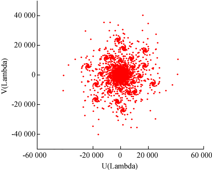 其中,u, v为投影平面也称作空间频率;l, m为平时的天空面。(2)式表明干涉仪的输出是亮度分布傅里叶变换的一个(u, v)分量,随着u, v的不同可以得到不同空间频率分量的值,所有的空间频率分量总称复可见度函数。对复可见度函数进行傅里叶逆变换得到天空亮度分布,即图像,这被称为综合孔径成像原理[10]。