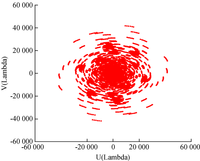 | $ \begin{align} & {\rm{采样函数:}}\ \ {{S}_{{{t}_{J}}}}\left( u, v \right)=\sum\limits_{j=1}^{N}{{{S}_{{{t}_{j}}}}({{u}_{j}}, {{v}_{j}})}\ \ \ \ (N=\frac{{{t}_{a}}}{{{t}_{{\rm{int}}erval}}}). \\ & {\rm{采样输出:}}\ \ {{V}_{{{t}_{J}}}}\left( u, v \right)=\sum\limits_{j=1}^{N}{{{V}_{{{t}_{j}}}}({{u}_{j}}, {{v}_{j}})\ }\ \ \ (N=\frac{{{t}_{a}}}{{{t}_{{\rm{int}}erval}}}). \\ & {\rm{UV覆盖增加脏图:}}\ \ {{I}_{\rm{D}}}\left( l, m \right)=\iint{{}}{{S}_{{{t}_{J}}}}\left( u, v \right){{V}_{{{t}_{J}}}}\left( u, v \right){{e}^{{-\rm{i2 } \rm{ \mathsf{ π}}}(ul+vm)}}{\rm{d}}u{\rm{d}}v. \\ \end{align} $ | (5) |