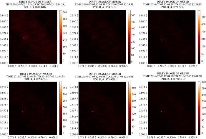 通过对采样数据积分处理,以每60 ms UV积分和间隔10 min增加UV覆盖混合积分方法为例,可以看出成图效果非常明显,经过一系列数据处理计算得到的脏图可以清楚地看出太阳边缘轮廓及其爆发位置,信噪比有了很大提升。并且随着积分时间的增加,得到的图像质量也有所提升。这一积分思路对于获得质量较优的MUSER观测结果有较好的作用。目前图像处理结果得到很大提升,但在成图前需要读取UVFITS数据文件,当前的UVFITS文件生成时间较慢,急需加快生成的效率。后续积分工作可以在积分时间上进行探索,利用评价指标寻找如何积分才能达到相对比较好的效果,给出UV积分时长、UV覆盖积分时间间隔以及总共60 min积分时间等参数的量化值。