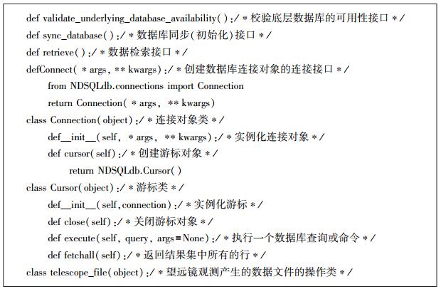 2.4 接口设计与实现基于上述的明安图射电频谱日像仪数据特征、补集理论以及为数据特征设计的特定记录格式,本文为明安图射电频谱日像仪的负数据库设计了相应的接口函数和类,如图 2。这些接口函数和类主要用于从观测数据文件构造特定格式的记录、从数据记录推导相应的数据帧信息以及连接底层数据库等。负数据库主要包括底层数据库可用性校验接口、望远镜数据文件操作有关的接口、数据库同步(初始化)接口、数据检索接口、元数据重构接口等。同时,负数据库接口设计与实现在一定程度上遵守Python DB-API规范②,可以降低系统各部分的相互依赖,提高组成单元的内聚性,降低组成单元间的耦合程度,进而提高系统的可维护性和可扩展性。
