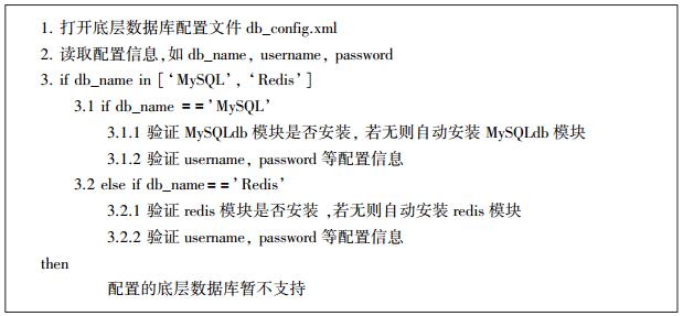 2.4.1 底层数据库可用性校验接口底层数据库可用性校验接口(validate_underlying_database_availability)只提供了对MySQL、Redis这两个数据库的支持,在以后的工作中逐渐增加对其他数据库的支持。底层数据库可用性校验接口主要用于验证底层数据库配置文件(db_config.xml)中的底层数据库是否支持、底层数据库对应的模块是否安装以及其它与数据库连接相关的配置信息是否有效等。底层数据库可用性校验接口的伪代码如图 3。