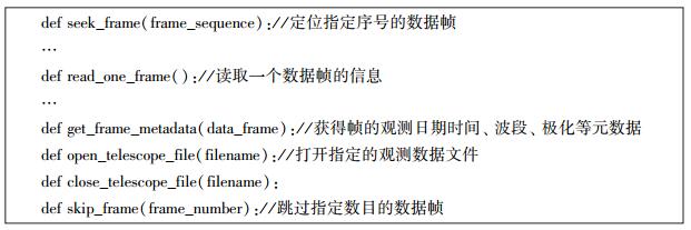 望远镜数据文件操作有关的接口主要基于明安图射电频谱日像仪数据处理系统(MUSEROS③)中的muserdata.py实现,主要提供对日像仪特有的裸数据文件(RawData[8])进行操作。望远镜数据文件操作有关的接口(图 4)主要包括定位特定帧位置的子接口、获取数据帧中观测日期时间等元数据的子接口、打开观测数据文件的子接口、关闭观测数据文件的子接口以及跳跃特定数目帧的子接口等。数据库同步接口以及数据检索接口等核心接口的功能都严重依赖望远镜数据文件操作有关的接口。