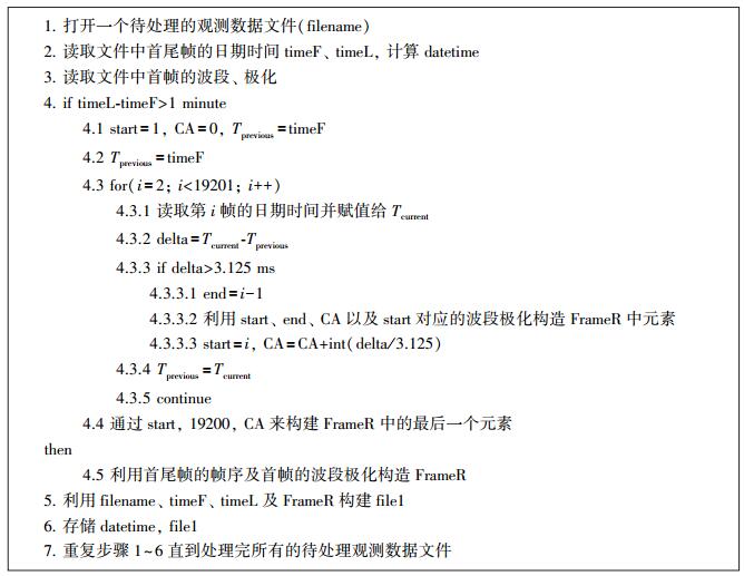 由于受当前存储系统性能的限制,将观测数据帧写入磁盘时会随机丢失数据帧,这无法保证封装到同一个文件中的19 200个数据帧在同一分钟内。并且,开始观测按钮是由人工启动的,无法保证在整分整秒恰好启动观测按钮。上述两种情况导致同一分钟观测产生的数据帧被存储到两个数据文件中。