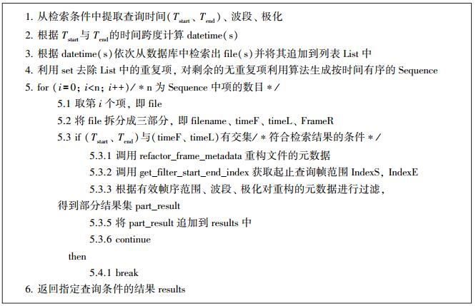 目前的数据检索接口只提供了依据给定的开始查询日期时间(Tstart)、结束查询日期时间(Tend)、波段信息以及极化方式下的数据检索功能,其他更加复杂条件的数据检索功能还有待进一步完善。数据检索接口的实现伪代码如图 6,该接口也是负数据库中的一个核心接口。同时,数据检索接口还调用了元数据重构函数(refactor_frame_metadata)、将Tstart及Tend转换成起止查询帧范围(IndexS, IndexE)的转换函数(convert_filter_start_end_index)等接口函数。
