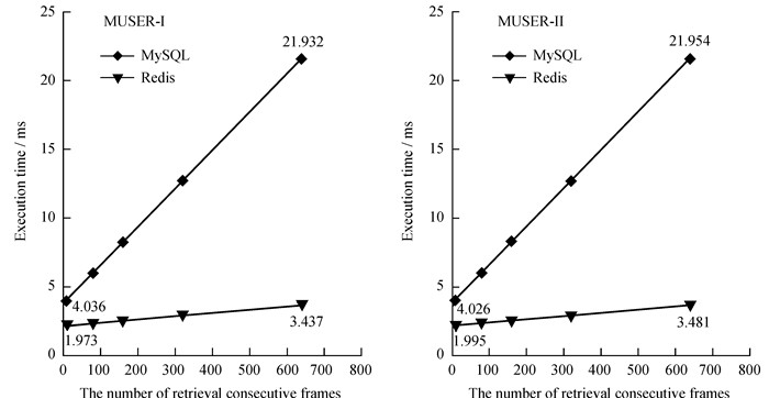测试了从数据库中分别检索1、8、80、160、320、640个连续数据帧的响应时间。同时为了保证数据检索响应时间的有效性和精确性,对每种数据检索操作重复进行100 000次并取平均响应时间作为测试结果。测试后得到的数据检索的平均响应时间对比见图 8。对于相同的数据,基于内存Redis的负数据库检索性能比基于MySQL的负数据库快2到6倍。对于低频阵和高频阵,使用相同底层数据库的负数据库的检索性能基本上相同。随着检索数据帧的增加,基于MySQL的负数据库的检索性能比基于Redis的负数据库检索性能恶化得更快。