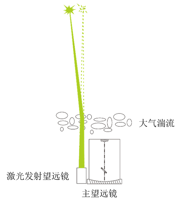 自适应光学系统需要足够亮度的导引星作为波前探测的信标,可以利用目标本身作为信标,也可以在目标的等晕区范围内寻找一颗合适亮度的自然导引星作为信标, 这样的系统称为自然导引星自适应光学(NGS-AO)系统。1985年,文[1]提出将人造激光导引星应用于天文自适应观测。激光导引星发射在目标的等晕区范围内,用于自适应光学系统的波前探测,这样的系统称为激光导引星自适应光学(LGS-AO)系统。理想的人造信标需要具有足够亮度,并且与目标的相对位置稳定。目前激光导引星虽然能够达到满足天文观测的亮度(Keck Ⅱ望远镜配备的下一代激光系统能够在天顶角小于15°范围内制造相当于R波段7.5等亮度的钠导星[2]),但是并不稳定,还需要在倾斜等晕区范围内寻找一颗恒星为其校正波前倾斜。如图 1,激光上行光路受大气湍流的影响,瞬时的激光信标与激光发射光轴有一定的偏移,这导致自适应光学系统波前传感器探测到的激光导引星波前倾斜量失真。