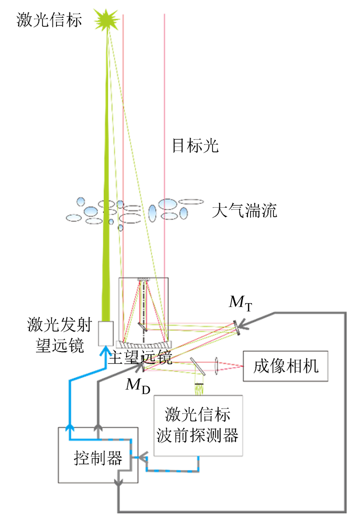 1 激光导引星波前倾斜测量方法的系统布局基于望远镜子孔径探测的激光导引星波前倾斜测量方法系统结构如图 2。激光由发射望远镜发射并在高空形成人造信标,信标光经大气湍流传输进入主望远镜。波前畸变的信标光首先通过波前校正系统(由倾斜反射镜MT和可变形反射镜MD组成),再利用分光反射分别进入成像系统和波前探测系统。假设忽略激光导引星和观测目标之间的大气湍流的影响,如果信标足够稳定,可以通过对信标波前的探测实时校正目标的波前畸变,以实现对目标的高分辨率成像。因为激光上行受大气湍流的影响,所以瞬时的激光信标与激光发射光轴有一定的偏移,这导致望远镜接收的波前畸变中有一个附加的倾斜量。波前信号由3部分组成:激光信标下行整体倾斜、波前高阶畸变信号、激光上行附加倾斜。如果不校正激光上行附加倾斜,目标在相机中的像不稳定,难以实现长时间曝光。本文提出一种算法,可以从波前传感器中分离信标上行抖动信息,由控制器生成信号控制激光发射望远镜的快速倾斜镜以稳定激光信标。系统中波前探测器将输出3路信号分别控制可变形反射镜MD、接收望远镜端倾斜反射镜MT和发射望远镜端快速倾斜镜。