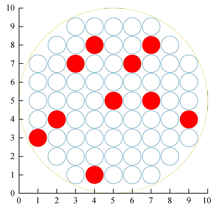 利用(5)式对随机选取的子孔径计算其算法误差的大小。如图 4,在望远镜口径范围内选定任意N个子孔径,对于任意两个子孔径之间的归一化倾斜相关系数由(6)式计算得出,其中子孔径之间的距离由子孔径之间的坐标关系给出,大气相干长度由下式计算: