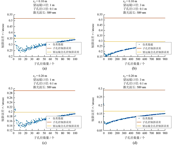 4 结论本文提出的子孔径优选算法,当从望远镜子孔径中随机选取部分子孔径时,各子孔径之间受大气湍流的影响相对独立,每个子孔径范围内的波前倾斜使微透镜的聚焦光斑产生的漂移量也是相对随机的。用平行光标定的基准位置为0点,多个随机漂移量的平均值将接近0值,而且随着子孔径的数量增加越接近0值。但是随着选择的子孔径数量继续增加,各子孔径之间受大气湍流影响的独立性下降,导致各子孔径的平均值更接近全口径的波前倾斜量。仿真结果表明,选择适当的子孔径数量做统计平均,可以有效地降低信标下行受大气湍流波前倾斜的影响,再由(4)式可以获得激光上行光路的到达角起伏信息,这将用于对激光导引星发射系统的校正,从而获得更加稳定的激光导引星。随着望远镜口径的增大,统计平均算法引入的相对误差越小,当望远镜口径为10 m时,算法误差仅为望远镜全口径倾斜误差的33%。